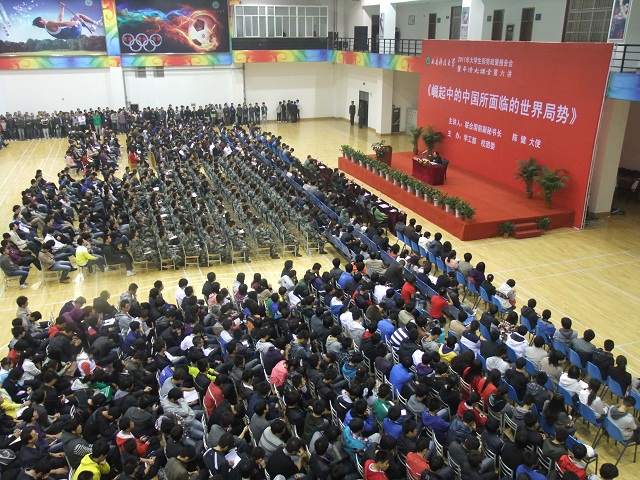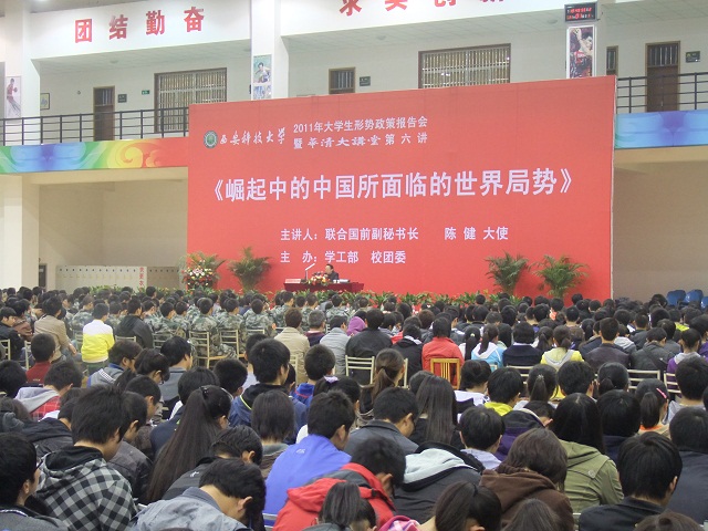 11月1日晚,联合国前副秘书长陈健大使应邀为全校师生作了题为《崛起中的中国所面临的世界局势》的报告。报告会在我校临潼校区体育馆一楼大厅举行。校党委副书记张立杰,学工部、校团委负责人,思政部全体教师,各学院分管学生工作的书记,学工部、校团委全体人员,临潼校区全体辅导员,学生代表2000余人参加了报告会。本次报告会由学工部、校团委共同举办,是我校2011年大学生形势政治报告会暨华清大讲堂第六讲。
