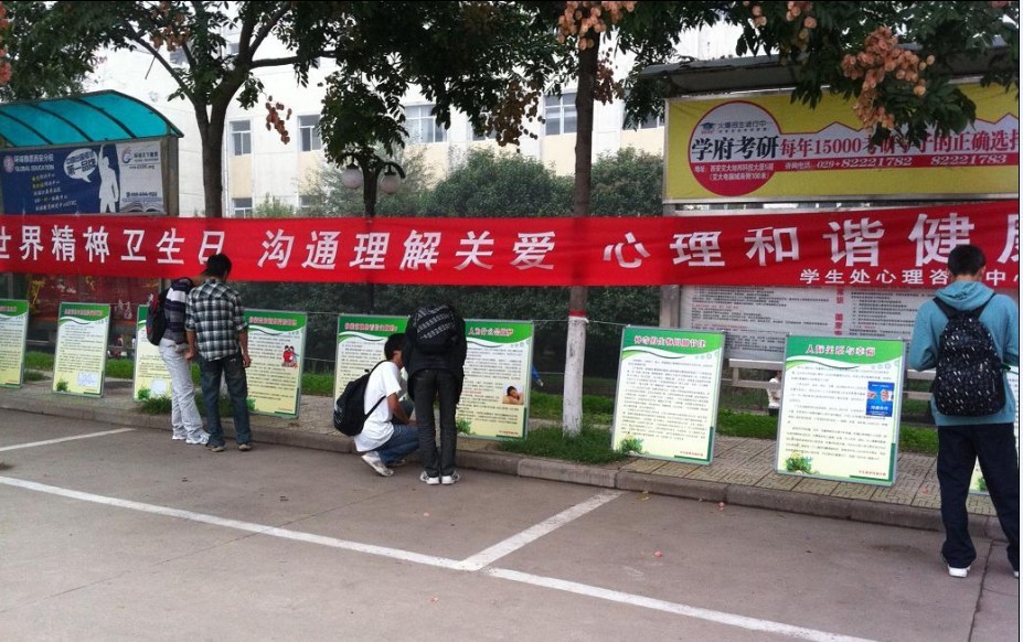 10月10日为世界精神卫生日,为了动员我校广大师生关注心理健康问题,心理咨询中心在临潼校区骊秀苑门前展示宣传板,向来往学生分发宣传材料,并在校园内多处悬挂横幅等。宣传活动通过多种形式号召同学们关注自我的心理健康,了解科学的心理知识。